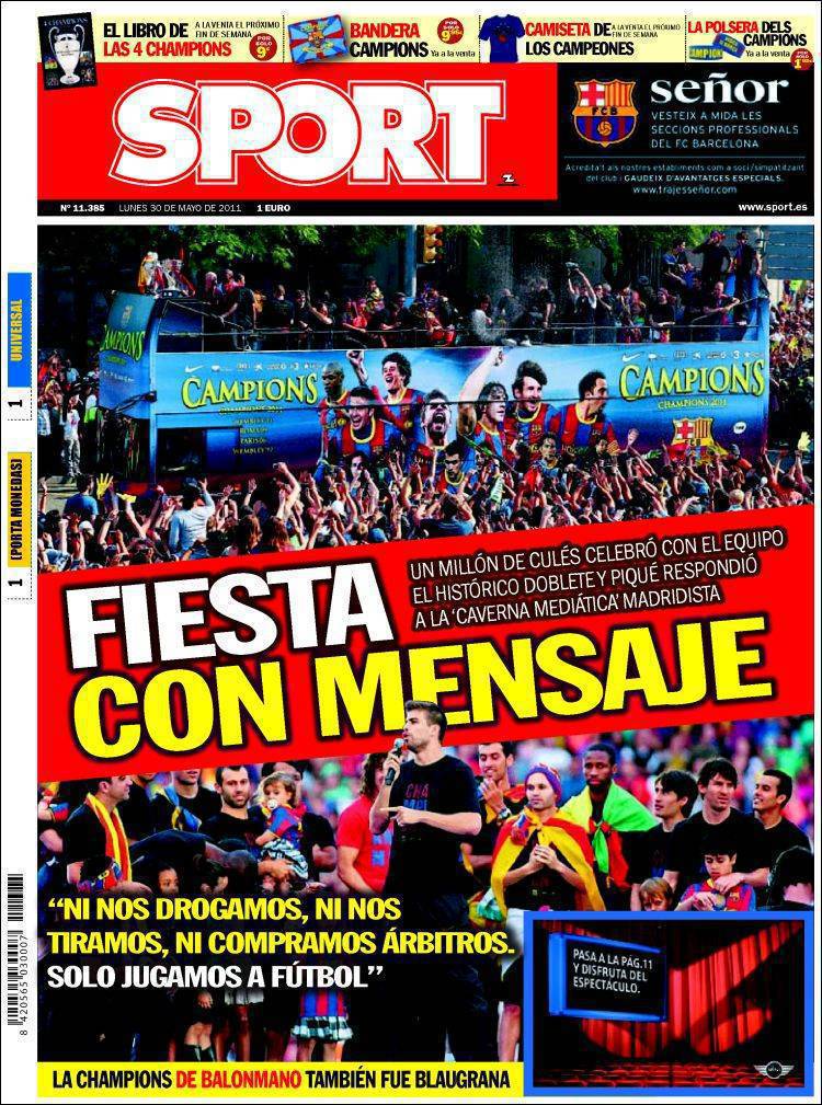 SPORT BARCELLONA – Sul quotidiano catalano Sport si parla della festa del Barcellona per la vittoria della Champions League con un messaggio chiaro di Piquè.