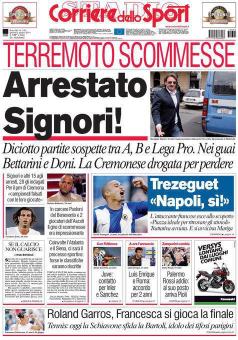 CORRIERE SIGNORI CALCIO SCOMMESSE – Anche il Corriere dello Sport parla dello scandalo calcio scommesse con l’arresto di Beppe Signori.
