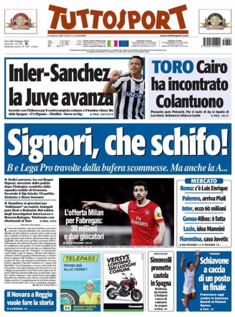 TUTTOSPORT SIGNORI – Tuttosport si accoda ai due giornali e parli dello scandalo del calcio scommesse. Molte partite di Lega Pro truccate, anche qualche partita di Serie B e forse Serie A.