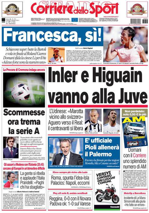 CORRIERE INLER HIGUAIN JUVENTUS – Sul Corriere dello Sport si parla del mercato Juventus con il probabile arrivo di Inler e Higuain.