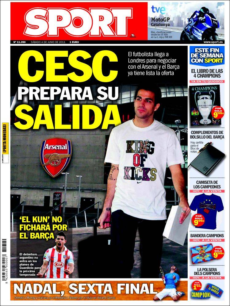 Sport: Cesc prepara la sua uscita 04/06/2011 di Ruggieri SPORT FABREGAS – Sul quotidiano Sport si parla di Fabregas, centrocampista spagnolo dell’Arsenal che potrebbe approdare al Barcellona nella prossima stagione. Claudio Ruggieri – www.calciomercatonews.com