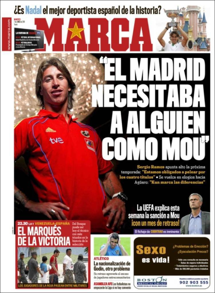 Marca: “Al Real Madrid serviva qualcuno come Mou” 07/06/2011 di Ruggieri REAL MADRID MOURINHO MARCA – Sul quotidiano Marca intervista a Sergio Ramos che elogia Mourinho. Claudio Ruggieri – www.calciomercatonews.com