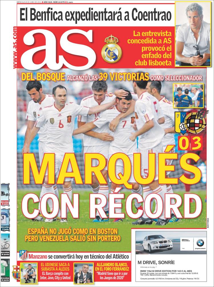 AS SPAGNA – Sul quotidiano Marca si parla della vittoria della Spagna contro il Venezuela con Del Bosque che vince la 39esima partita da c.t. della Spagna.