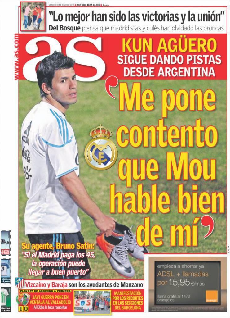 AS AGUERO MOURINHO – Sul quotidiano As vengono riportate le dichiarazioni di Aguero che ringrazia Mourinho per le belle parole.