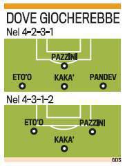 CALCIOMERCATO INTER LEONARDO KAKA’ – I tifosi dell’Inter sognano un altro sgarbo ai cugini del Milan. Dopo l’arrivo di Leonardo ad Appiano Gentile si pensa a portare nella Milano nerazzurra Ricardo Kakà, ex idolo della tifoseria rossonera, oggi malinconico campione del Real Madrid che non sembra aver trovato il feeling giusto con il tecnico Mourinho. Kakà potrebbe arrivare all’Inter spinto da Leonardo, suo grande amico che lo portò in Italia al Milan dal San Paolo. Il tecnico nerazzurro ha già studiato due schemi adatti per inserire il giocatore brasiliano. Il primo è il 4-2-3-1 con Kakà centrale nella linea dei trequartisti, mentre l’altro modulo è il classico 4-3-1-2 con Kakà trequartista dietro a Pazzini ed Eto’o. Ecco la foto della Gazzetta dello Sport.