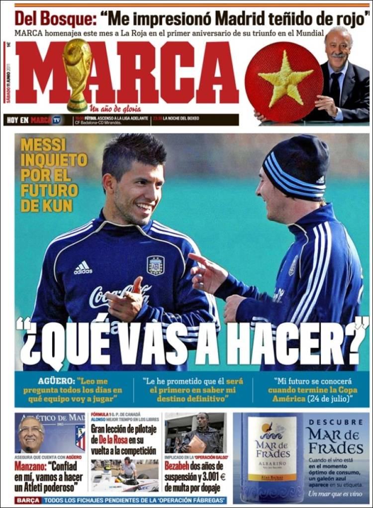 MARCA MESSI AGUERO – Sul quotidiano Marca si parla del futuro di Aguero, con il compagno di Nazionale Messi preoccupato per il possibile arrivo di Aguero al Real Madrid.