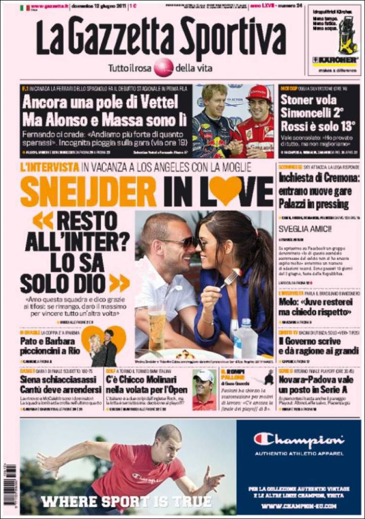 GAZZETTA DELLO SPORT SNEIJDER INTER – La Gazzetta dello Sport apre l’edizione odierna con un’intervista al trequartista dell’Inter Wesley Sneijder attualmente in vacanza a Los Angeles con la moglie. Il giocatore nerazzurro lancia ombre sul proprio futuro dichiarando: “Resto all’Inter? Lo sa solo Dio.”.