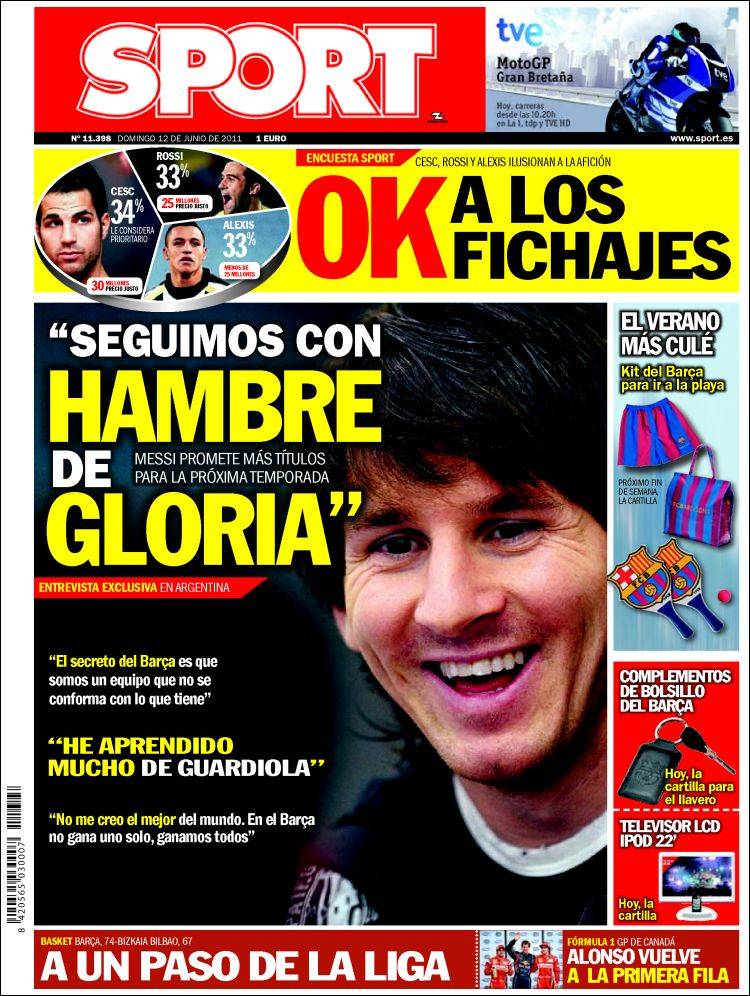 SPORT MESSI BARCELLONA – Il quotidiano spagnolo Sport apre con un’intervista esclusiva al giocatore più forte del mondo, l’attaccante del Barcellona Lionel Messi che non vuol smettere di vincere ammettendo la fame di gloria che hanno lui e i suoi compagni.