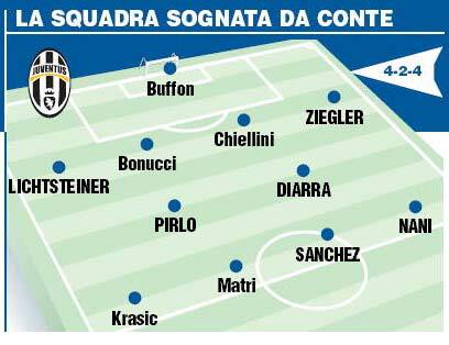 CALCIOMERCATO JUVENTUS CONTE – Una super squadra in grado di tornare a primeggiare subito in Italia. Questo è quello che vuole Antonio Conte, tecnico della Juventus, come riportato da Tuttosport. Il tecnico bianconero chiede rinforzi importanti soprattutto in attacco, con Sanchez che andrebbe ad affiancare Matri in attacco mentre a sinistra, come ala d’attacco, ci sarebbe Nani del Manchester United. A centrocampo assieme a Pirlo il francese Diarra del Real Madrid, mentre in difesa a destra Lichtsteiner, con Bonucci e Chiellini centrali e Ziegler a sinistra. La palla ora passa a Marotta che dovrà cercare di portare a Torino sia Sanchez che Nani, non sarà certamente facile.