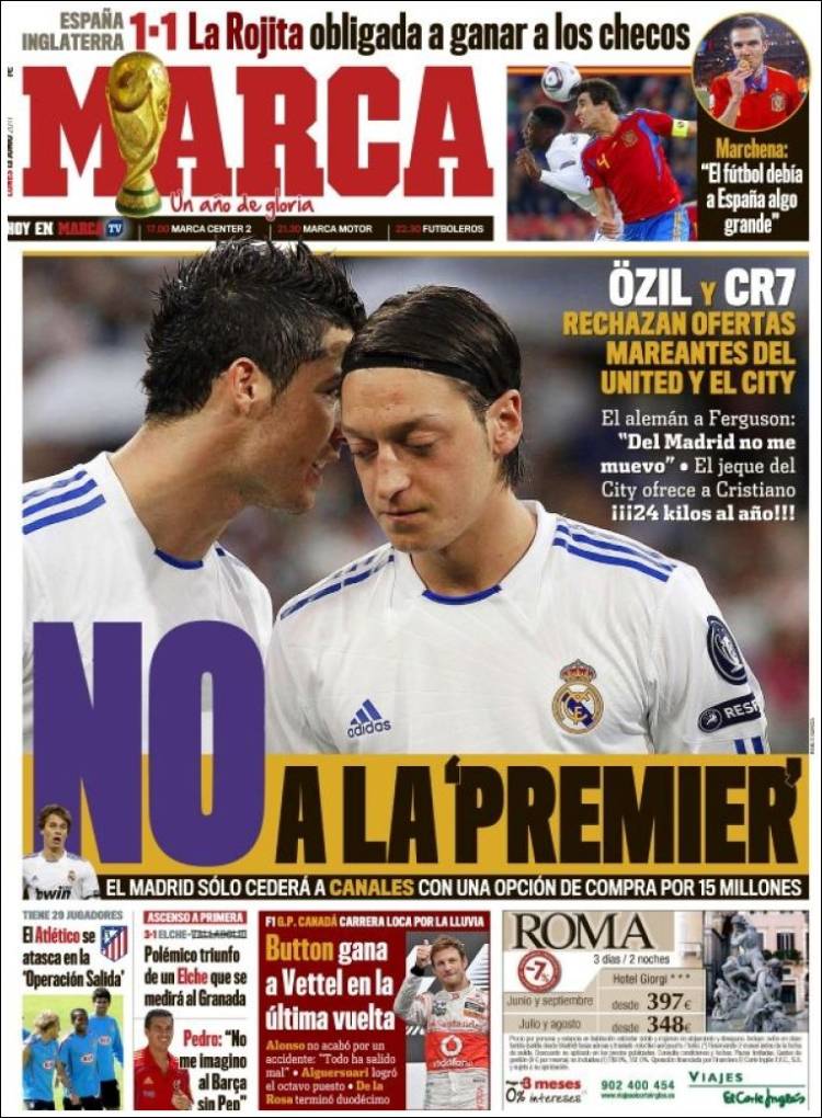 Marca: No alla Premier 13/06/2011 di Ruggieri MARCA OZIL RONALDO PREMIER LEAGUE – Sul quotidiano Marca si parla di Ozil e Ronaldo, entrambi vogliono rifiutare le proposte di United e City. Claudio Ruggieri – www.calciomercatonews.com