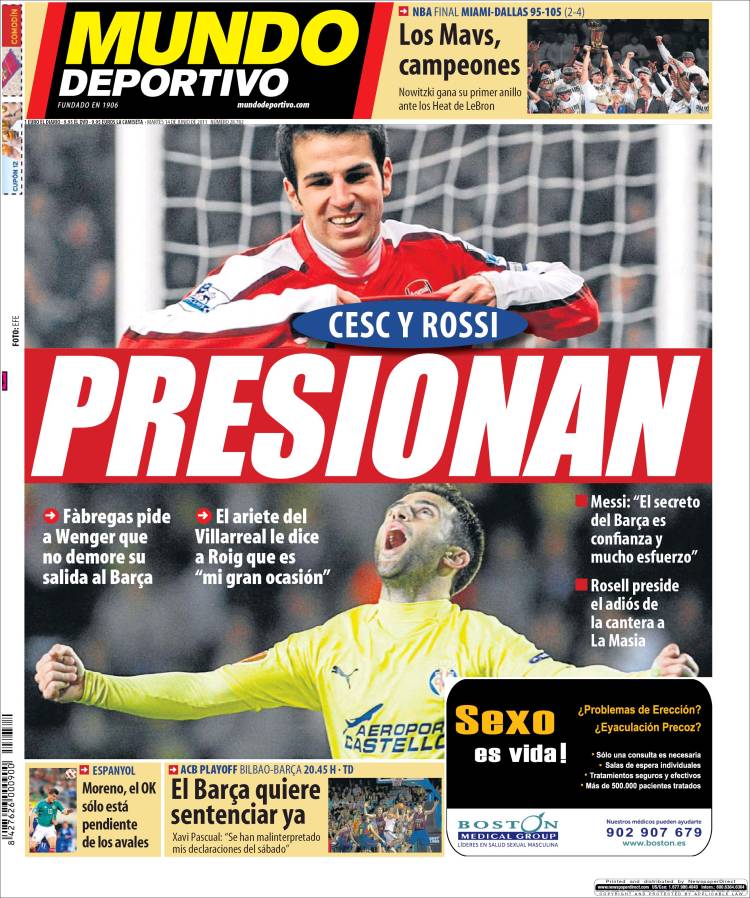 MUNDO DEPORTIVO FABREGAS SANCHEZ – Sul quotidiano catalano Mundo Deportivo si parla del mercato Barcellona con Fabregas e Sanchez nel mirino.