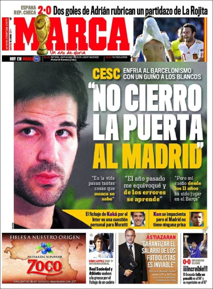 MARCA FABREGAS REAL MADRID – Sul quotidiano Marca si parla del futuro di Fabregas che ha dichiarato di non voler chiudere la porta al Real Madrid.