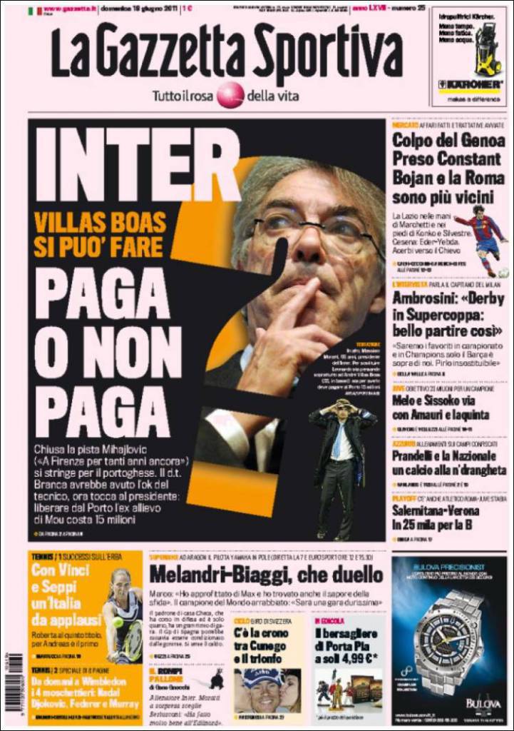 GAZZETTA DELLO SPORT PAGA NON PAGA – Continua la telenovela legata al nome del futuro allenatore dell’Inter. Villas Boas, secondo la Gazzetta dello Sport di oggi, può arrivare anche senza pagare la clausola di 15 milioni di euro al Porto.