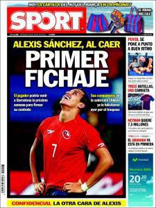SPORT ALEXIS SANCHEZ – Anche il quotidiano Iberico Sport quest amattina pubblica una bella fotonotizia sul talentio dell’Udinese Alexis Sanchez che, secondo quanto riportato proprio dai Media Spagnoli, avrebbe già accettato l’offerta dei Catalani.