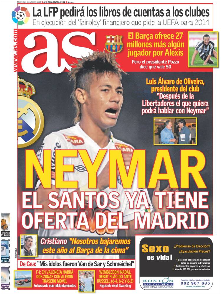 AS SANTOS REAL MADRID – Sul quotidiano spagnolo As si parla di Neymar, talento brasiliano del Santos che è nel mirino del Real Madrid.