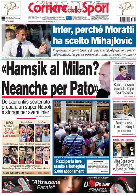 CORRIERE HAMSIK MILAN PATO – Sul Corriere dello Sport vengono riportate le dichiarazioni del presidente del Napoli De Laurentiis che ha blindato Hamsik richiesto dal Milan.