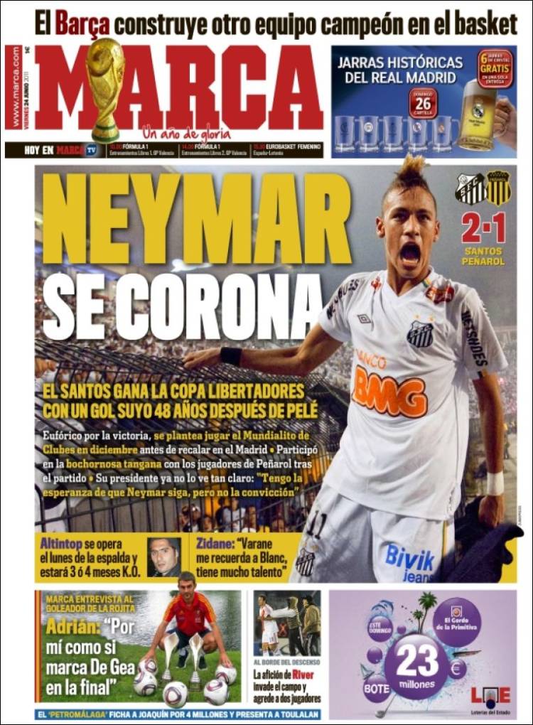 MARCA NEYMAR REAL MADRID – Sul quotidiano spagnolo Marca si parla del Santos che ha vinto la Libertadores vincendo due a uno contro il Penarol con i gol di Neymar e Danilo.