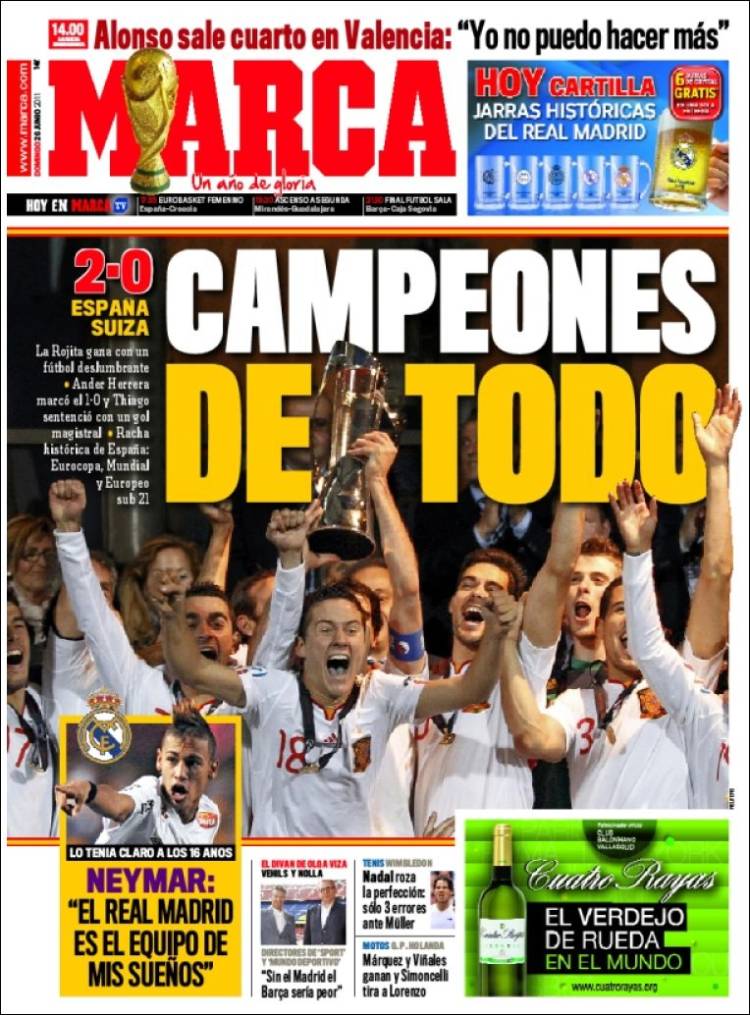 MARCA NEYMAR REAL MADRID – Prima pagina di Marca, quotidiano spagnolo, dedicata interamente alla vittoria della nazionale under 21 della Spagna, nella finale del europeo di categoria. In piccolo troviamo però delle interessanti dichiarazioni del giovanissimo Neymar che ha parlato del Real Madrid, squadra che sembra la più vicina a prenderlo, come la squadra dei suoi sogni.