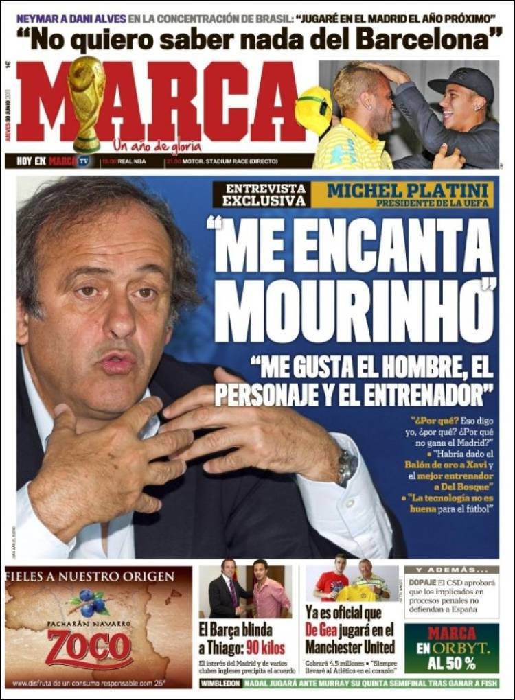 MARCA PLATINI MOURINHO – Sul quotidiano spagnolo Marca intervista a Michel Platini, presidente dell’Uefa, che ha elogiato Mourinho.