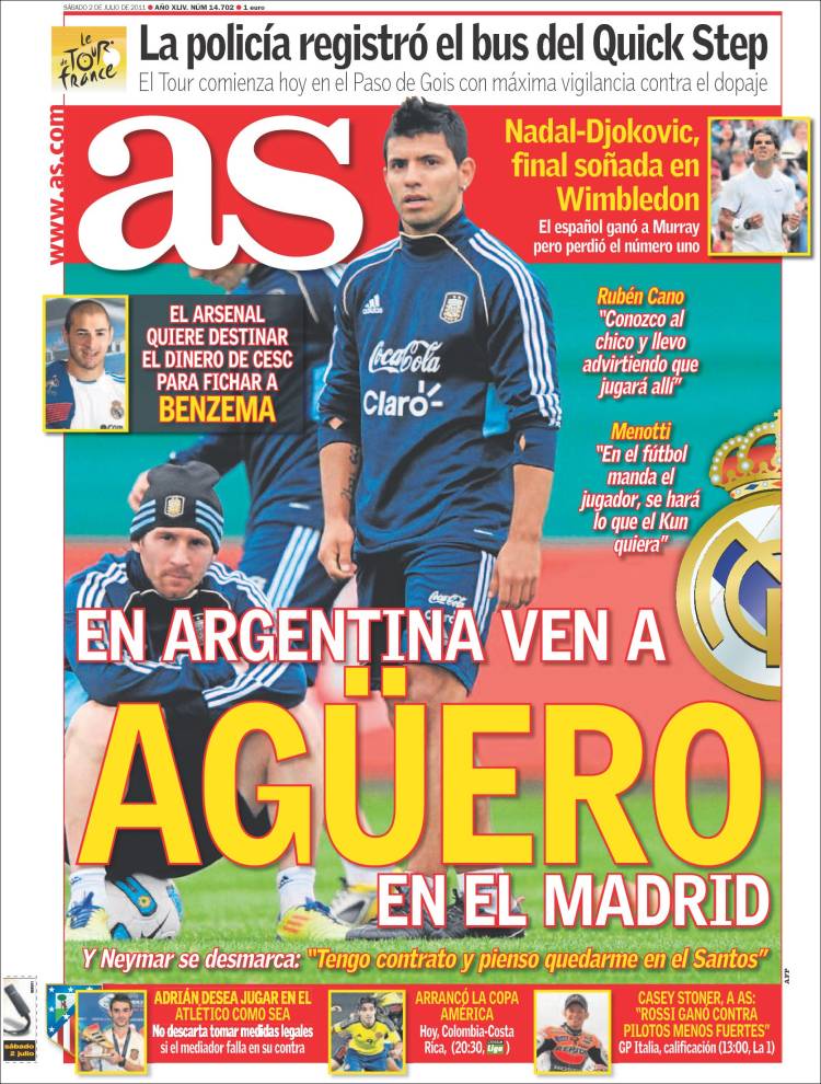 AS ARGENTINA AGUERO REAL MADRID – Sul quotidiano spagnolo As si parla di Aguero che è vicino al Real Madrid, almeno secondo la stampa argentina.