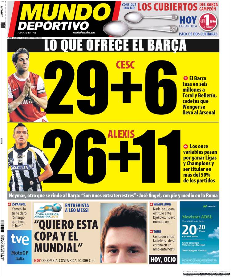 MUNDO DEPORTIVO BARCELLONA – Sul quotidiano catalano Mundo Deportivo si parla delle offerte del Barcellona per Sanchez e Fabregas.