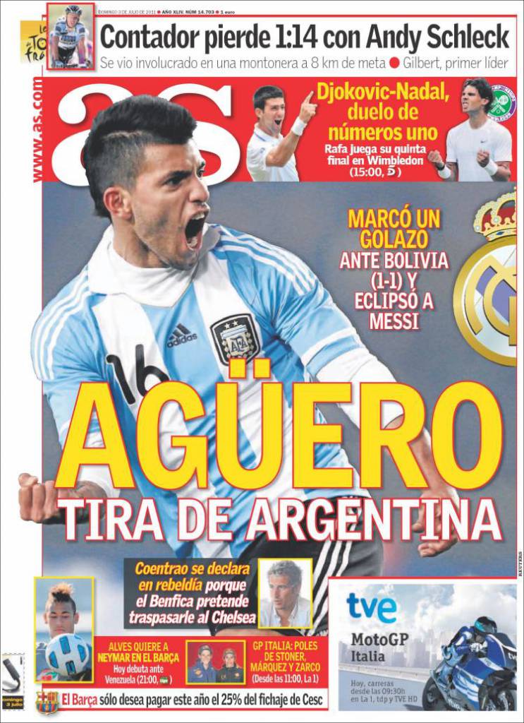 AS AGUERO – Mentre in Italia si continua a parlare della corte della Juventus per Sergio Aguero, il quotidiano Spagnolo As porta vicino al Real Madrid il giocatore Argentino, protagonista con la sua nazionale della Copa America.