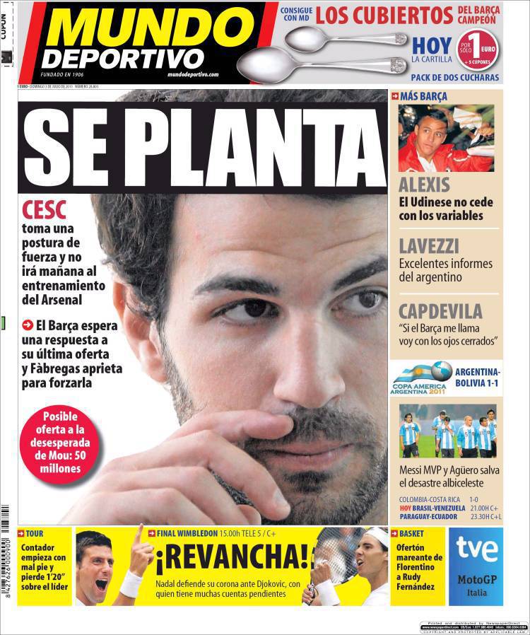 MUNDO DEPORTIVO – Adesso anche Fabregas non ci sta più e si impunta affinchè venga concretizzato il suo passaggio al Barcellona: secondo il Mundo Deportivo, domani il capitano dell’Arsenal non si recherà all’allenamento dell’Arsenal in segno di protesta.
