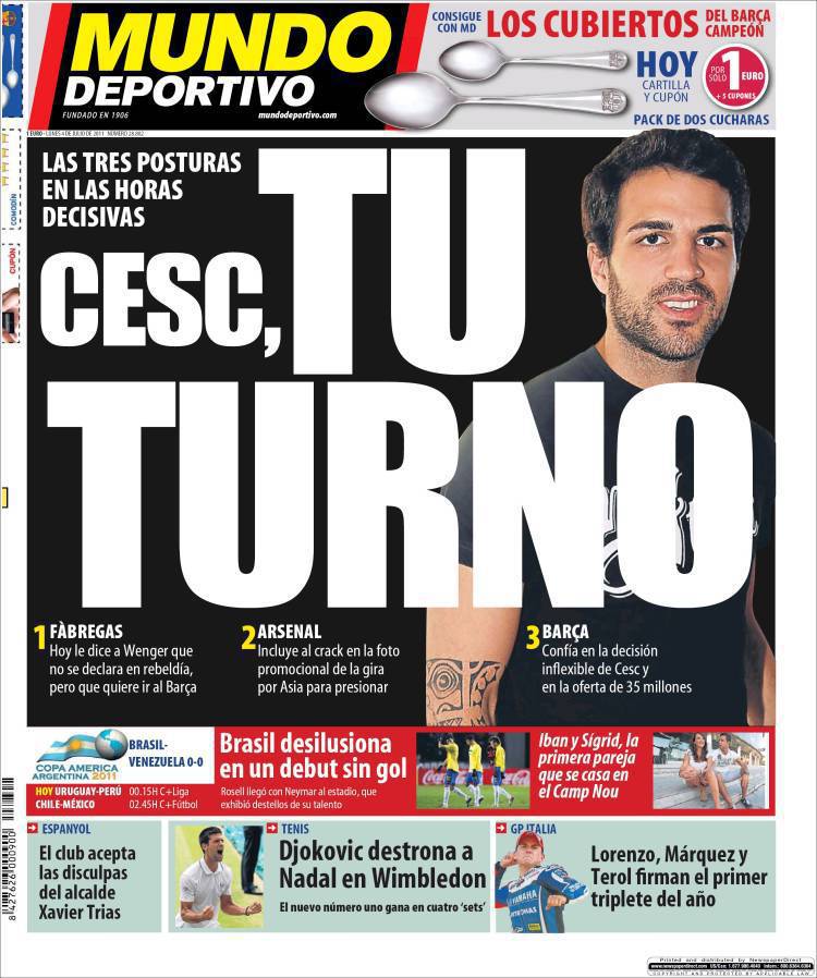 MUNDO DEPORTIVO FABREGAS – Sul quotidiano Mundo Deportivo si parla di Fabregas che è molto vicino al Barcellona.