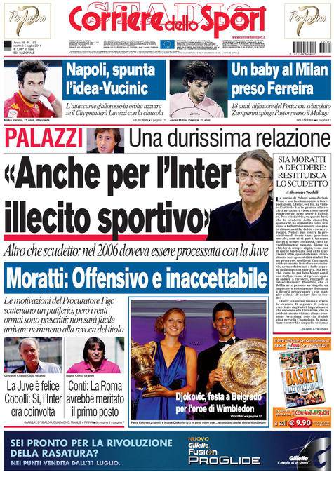 CORRIERE INTER ILLECITO – Il Corriere dello Sport titola in prima pagina le motivazioni di Palazzi che parla di illecito sportivo anche per l’Inter.