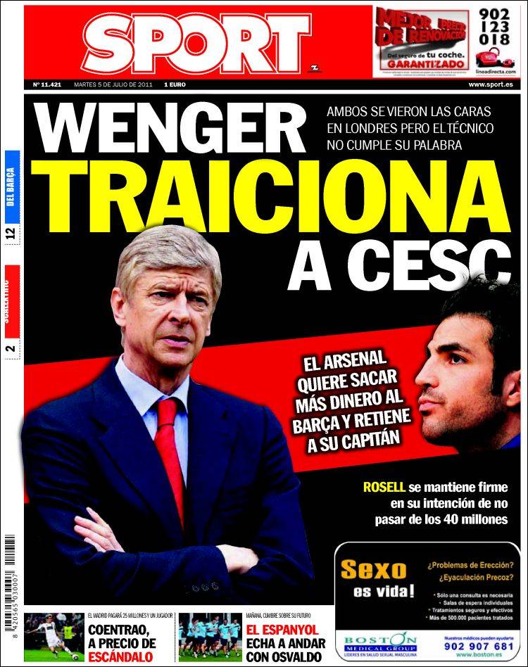 SPORT WENGER FABREGAS – Sul quotidiano catalano Sport si parla del possibile acquisto di Fabregas da parte del Barcellona. Wenger, manager dell’Arsenal, chiede più denaro per il capitano dei Gunners.