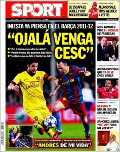 SPORT BARCELLONA INIESTA FABREGAS -Il quotidiano spagnolo Sport si apre con un’intervista al centrocampista del Barcellona Andres Iniesta che invoca l’acquisto del centrocampista dell’Arsenal nonchè suo compagno di squadra in nazionale Cesc Fabregas.