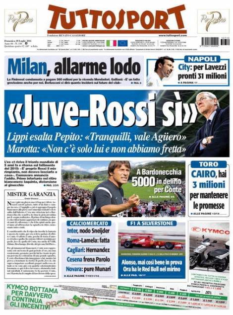 TUTTOSPORT JUVENTUS GIUSEPPE ROSSI LIPPI – Il quotidiano torinese Tuttosport mette in primo piano un’intervista all’ex allenatore della nazionale italiana e della Juventus Marcello Lippi in cui l’allenatore consiglia alla società bianconera di prendere Giuseppe Rossi senza alcun problema o remora.