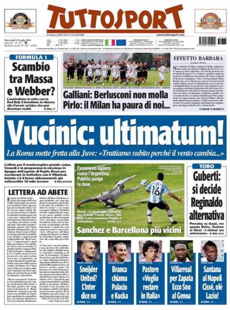 TUTTOSPORT VUCINIC – Su Tuttosport si parla dell’ultimatum della Roma alla Juventus per quanto riguarda Vucinic. Il montenegrino piace ai bianconeri.