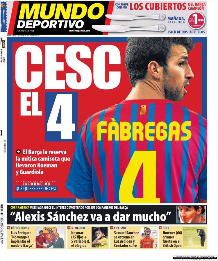 MUNDO DEPORTIVO FABREGAS – Sul quotidiano Mundo Deportivo si parla di Fabregas con il Barcellona che gli riserverà il numero 4.