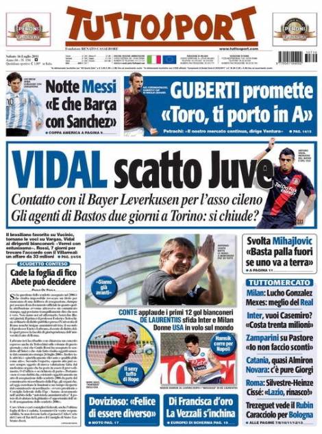 Tuttosport: Vidal scatto Juve 16/07/2011 di Ruggieri TUTTOSPORT VIDAL JUVENTUS – Su Tuttosport si parla del mercato Juventus con il possibile arrivo di Vidal. Claudio Ruggieri – www.calciomercatonews.com