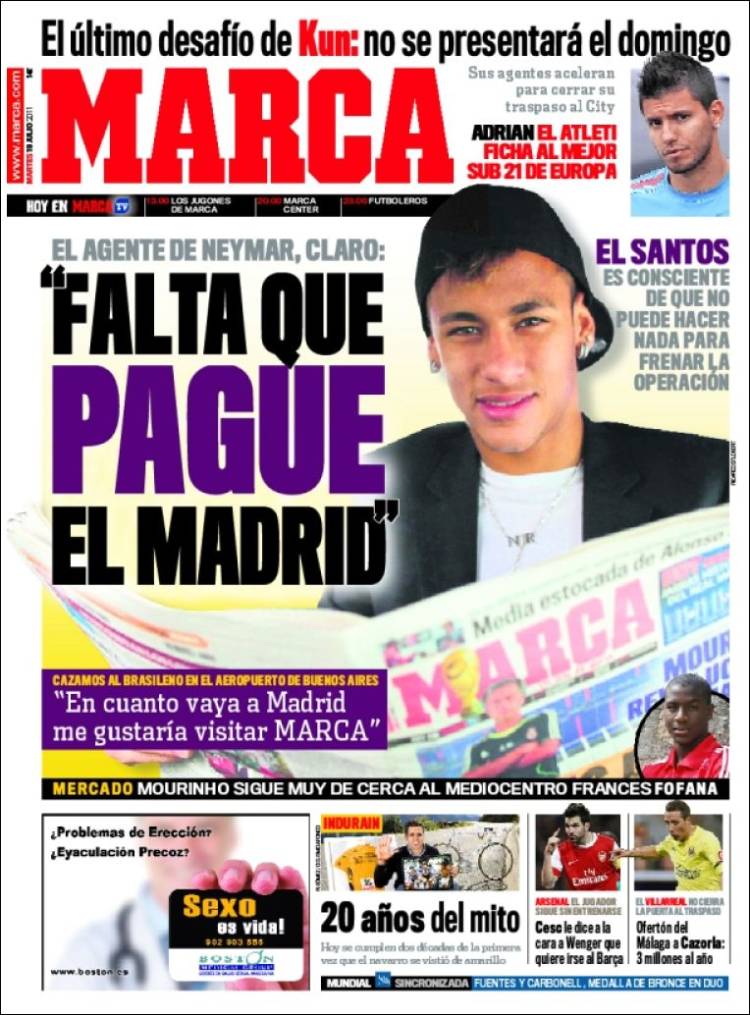 MARCA REAL MADRID NEYMAR – L’agente di Neymar dichiara che per l’arrivo a Madrid del suo assistito manca solo il pagamento del Real Madrid nei confronti del Santos.