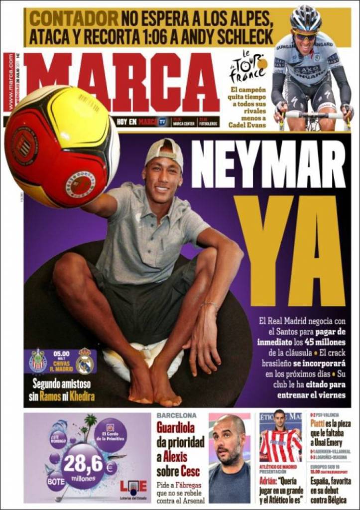 MARCA NEYMAR – Sul quotidiano Marca si parla di Neymar, talento brasiliano del Santos che piace molto al Real Madrid.