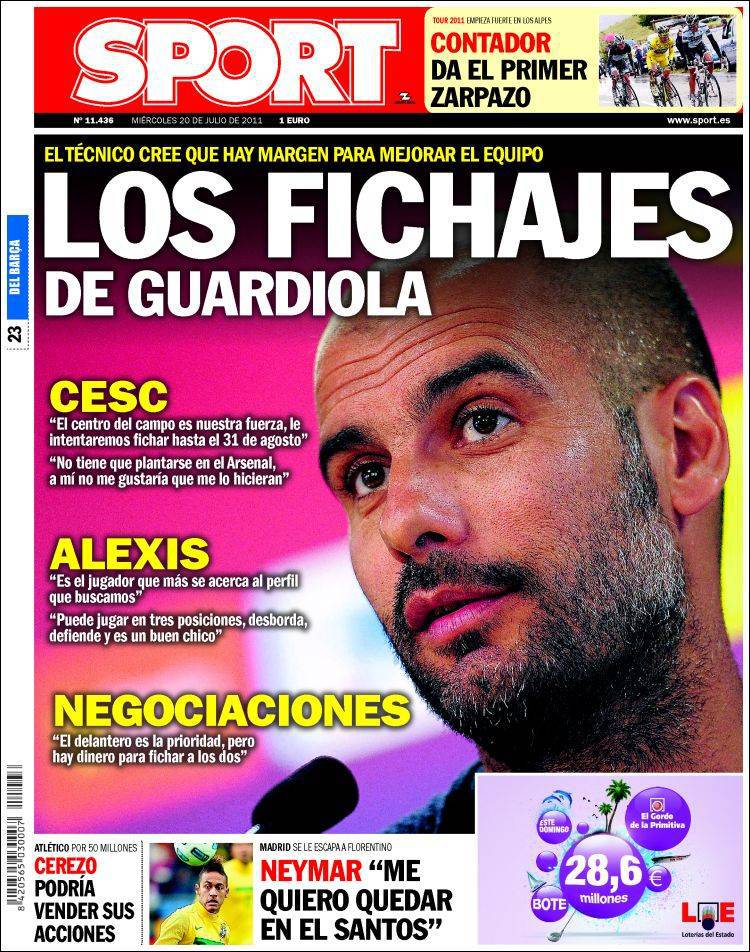 SPORT GUARDIOLA ATTACCANTI – Sul quotidiano catalano Sport si parla degli acquisti di Guardiola, tecnico del Barcellona, che vuole Fabregas e Sanchez.