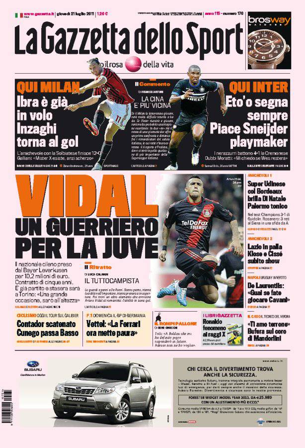 GAZZETTA VIDAL JUVENTUS – Sulla Gazzetta dello Sport si parla di Vidal, nuovo centrocampista della Juventus.