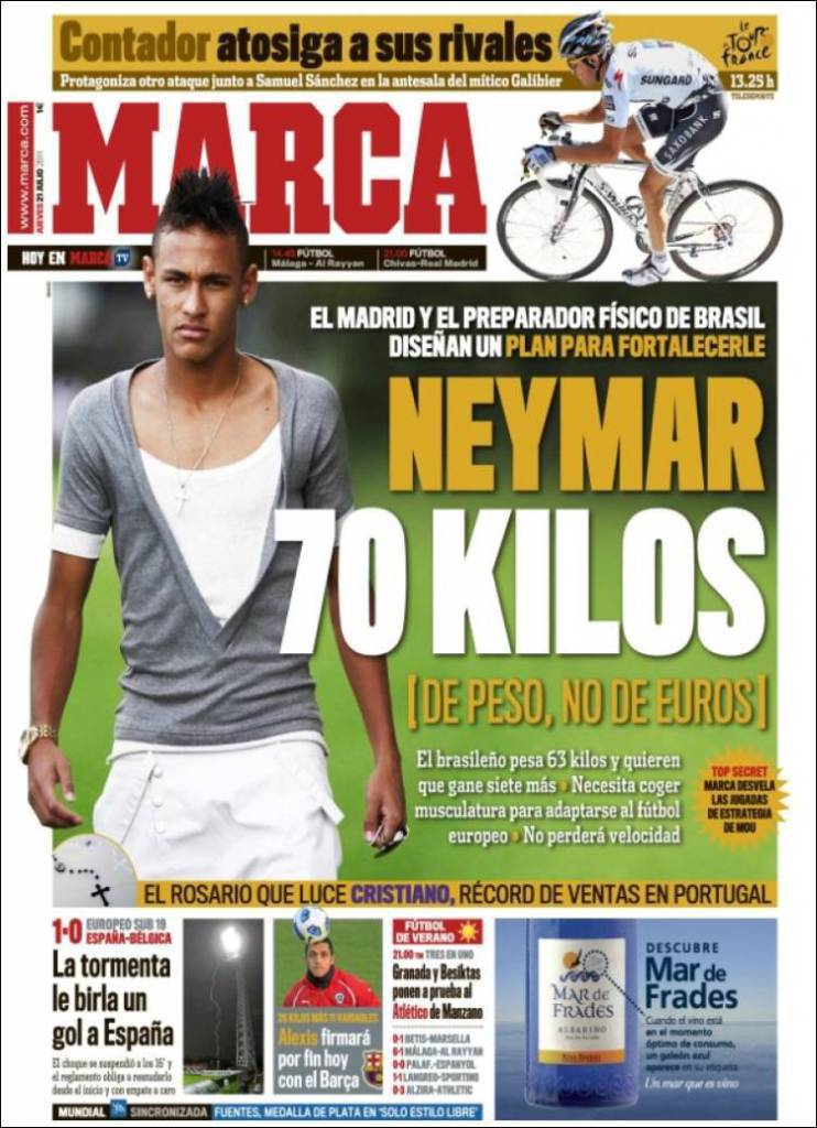 MARCA NEYMAR – Sul quotidiano Marca si parla di Neymar, stella del Santos. Il Real Madrid ha già preparato per lui un allenamento speciale.
