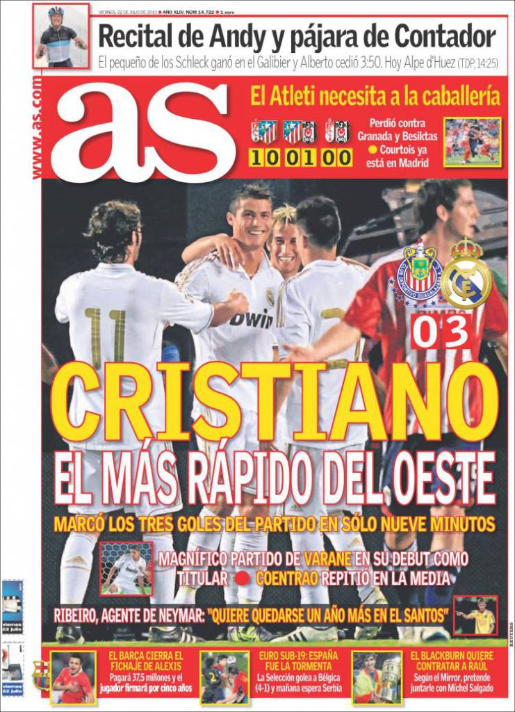 AS / Prima pagina di As dedicata a Cristiano Ronaldo che con i suoi tre goal in dieci minuti rifilati al Chivas Guadalajara ha stabilito un vero e proprio record personale.