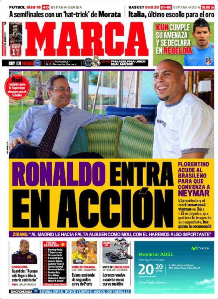 MARCA RONALDO – Florentino Perez, secondo quanto dichiarato dal quotidiano Spagnolo Marca, avrebbe contattato una sua vecchia conoscenza per poter concludere più facilmente la trattativa per Neymar: Ronaldo che è adesso pronto ad entrare in azione per il Real Madrid.