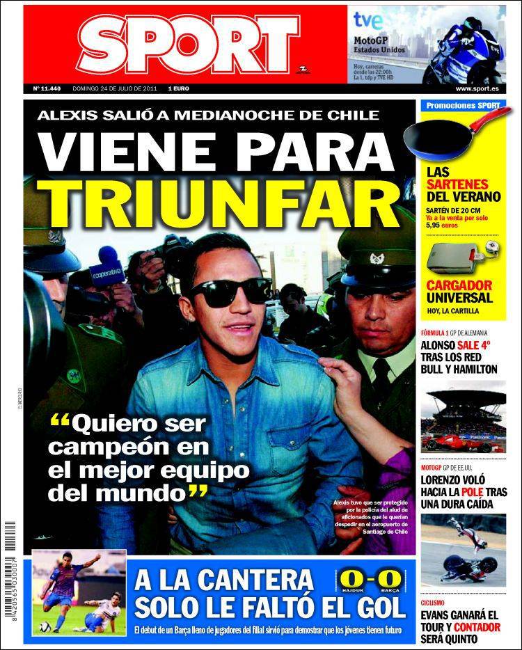 SPORT SANCHEZ – Bella fotonotizia del quotidiano Spagnolo Sport che dedica la prima pagina al nuovo arrivo Alexis Sanchez, che nelle prime dichiarazioni da giocoatore del Barcellona si è detto voglioso di iniziare a trionfare.