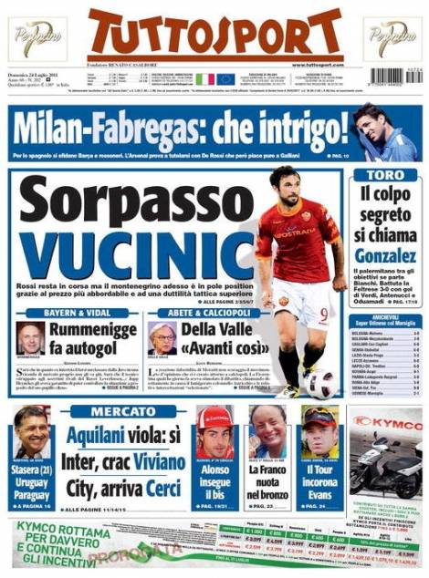 TUTTOSPORT SORPASSO VUCINIC – Il quotidiano Torinese Tuttosport, apre questa mattina con una clamorosa notizia riguardante il mercato della Juventus: Mirko Vucinic ha superato, nella lista di gradimento dei dirigenti bianconeri, il giocatore del Villareal Pepito Rossi.
