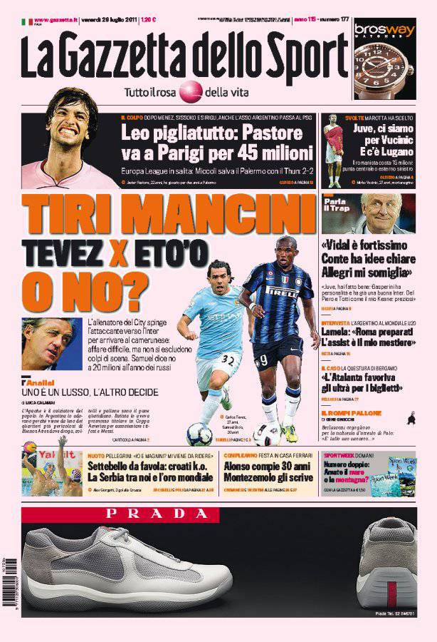 GAZZETTA MANCINI ETO’O TEVEZ – Samuel Eto’o è nel mirino del City di Mancini. In cambio il tecnico del City offre Tevez.