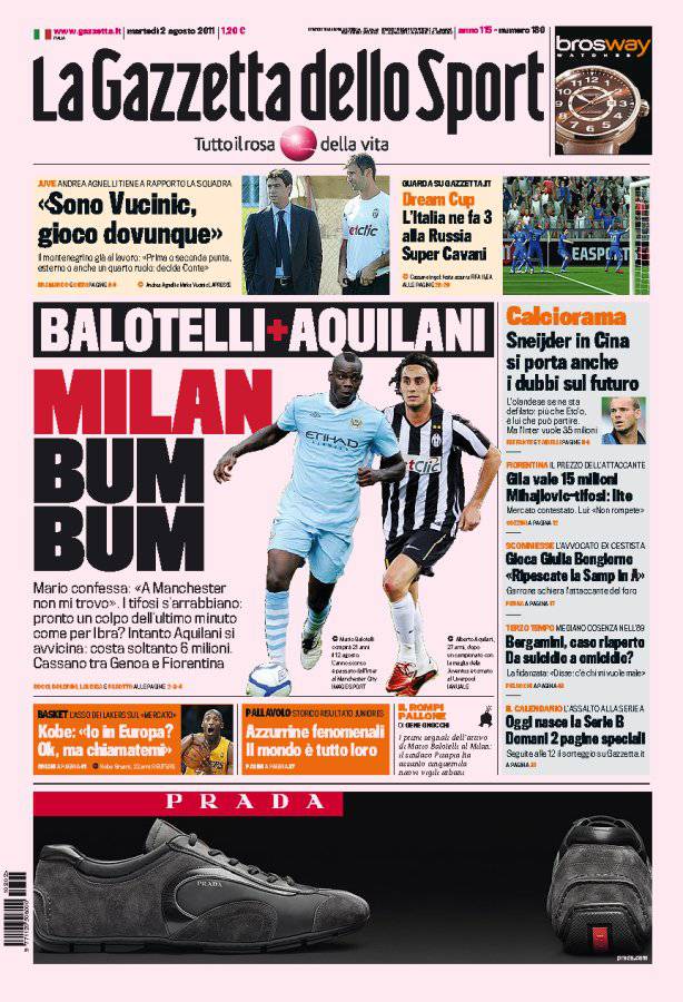 GAZZETTA BALOTELLI AQUILANI – Sulla Gazzetta dello Sport si parla del mercato del Milan con i possibili arrivi di Balotelli e Aquilani.