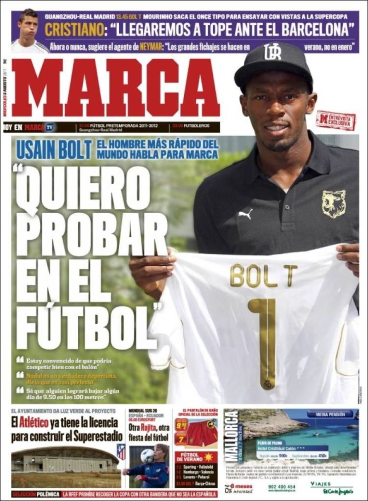 MARCA CALCIO BOLT – Sul quotidiano Marca l’uomo più veloce del mondo Usain Bolt ha dichiarato di voler provare a giocare a calcio.
