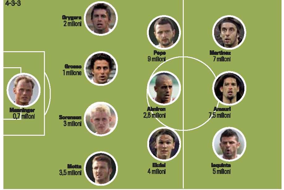 CALCIOMERCATO JUVENTUS MANNINGER AMAURI – Quanti esuberi in casa Juventus. Lo sa bene Beppe Marotta, dirigente della Juventus che vorrebbe cedere molti giocatori che non rientrano nei piani della Juventus. Una squadra che la Gazzetta dello Sport ha schierato con il 4-3-3 con Manninger in porta, poi i difensori Sorensen (che piace al Bologna), Motta, Grosso e Grygera, tutti giocatori con qualche offerta dall’estero. A centrocampo oltre ad Almiron, che piace a Bologna e Cagliari, ci sono Ekdal e Pepe, quest’ultimo finito ai margini. In attacco tridente formato da Martinez (potrebbe andare a Firenze), Amauri (piace al Genoa) e Iaquinta. Un valore totale di 45 milioni di euro. Ecco la foto.