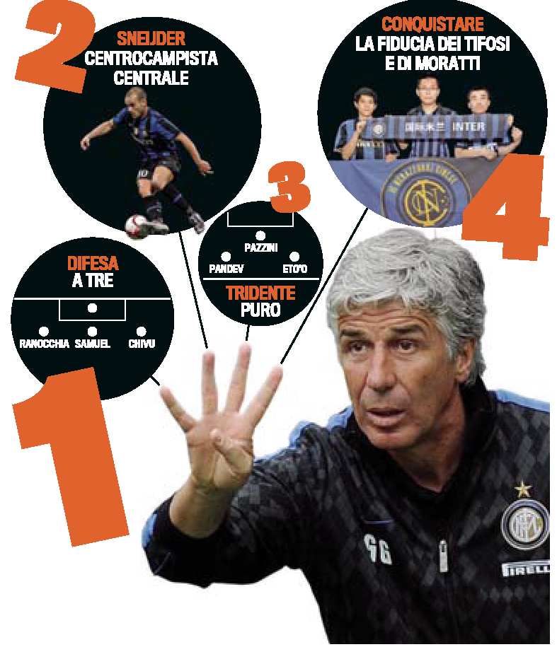 INTER SUPERCOPPA GASPERINI – Certo, Gian Piero Gasperini non dovrà preoccuparsi, in caso di sconfitta sabato in Supercoppa contro il Milan, non sarà certo a rischio esonero, ma il tecnico di Grugliasco vorrà in tutti i modi conquistare la fiducia di Moratti e dei tifosi dell’Inter. Questa è una delle mosse di Gasperini. Le altre sono tutte di livello tattico, perchè Gasperson non ha nessuna intenzione di rinunciare alla difesa a tre, con Ranocchia-Samuel-Chivu e neanche a Sneijder regista di centrocampo accanto a Stankovic. Come rivela la Gazzetta dello Sport per completare il tutto ci sarà un tridente puro in attacco, Eto’o, Pazzini e uno tra Pandev e Castaignos. Ecco la foto delle quattro mosse del Gasp.