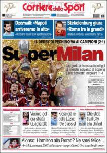CORRIERE DELLO SPORT SUPER MILAN – Prima pagina del Corriere dello Sport dedicata interamente alla vittoria del Milan in Supercoppa Italiana. I rossoneri, ieri a Pechino, hanno battuto l’Inter per 2-1.